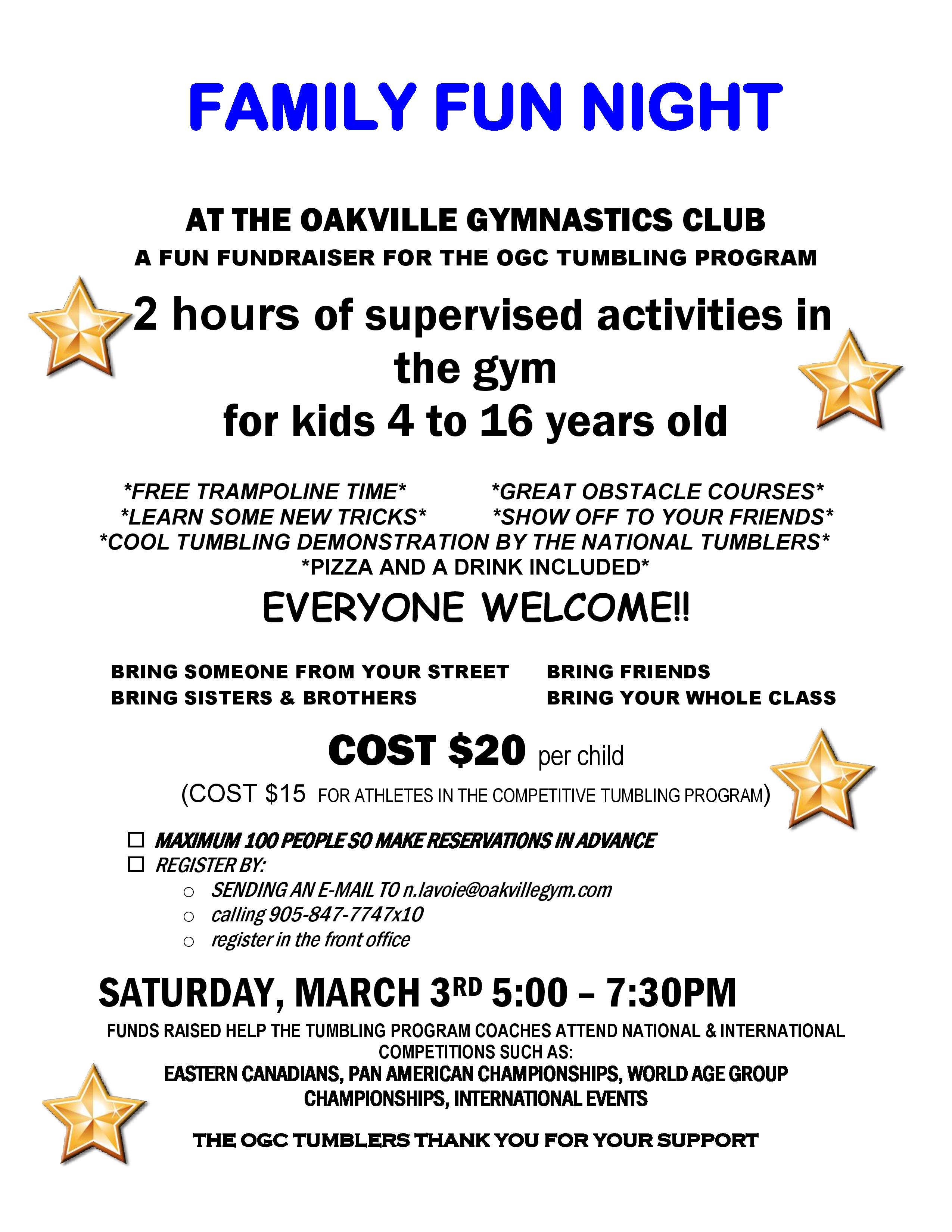 Our next Family Fun Night Tumbling Program fundraiser is coming up on Saturday, March 3rd. Registration is now available at the OGC Main office. Please register in advance in order to help us prepare for the evening. We are looking forward to another fun night. Thanks for supporting the OGC Tumbling program.