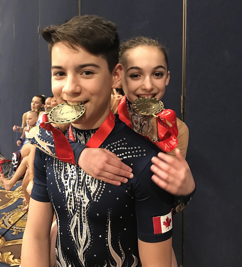 Mila: “I like that it is a team sport and I love the skills that we do in Acro. In our dynamic routine, we do a lot of flips and jumps, it’s like I’m flying in the air. And then there’s the balance routine where it’s all about strength and balance, presses and handstands. We work hard all year to get ready for competition season. I love going to competitions especially when we travel internationally. Going on trips is the best part! Acro has taken me to Italy and just recently to Las Vegas. My partner Theo and I did great and won our first International Gold medal. It was amazing to hear the Canadian National Anthem play as we received our medals.”