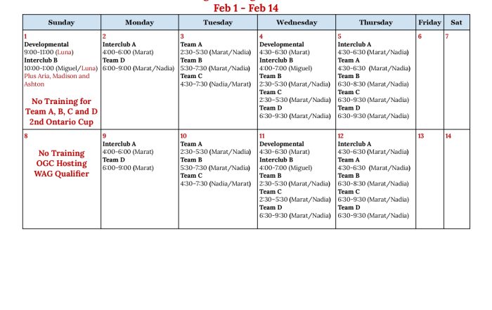 Tumbling Training Schedule 2026 Feb 1 – Feb 14