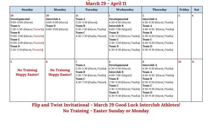 Tumbling Training Schedule 2026 March 29 – April 11